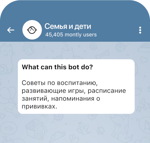 Бот помогает родителям с воспитанием детей, предлагает развивающие методики и советы по укреплению семейных отношений.